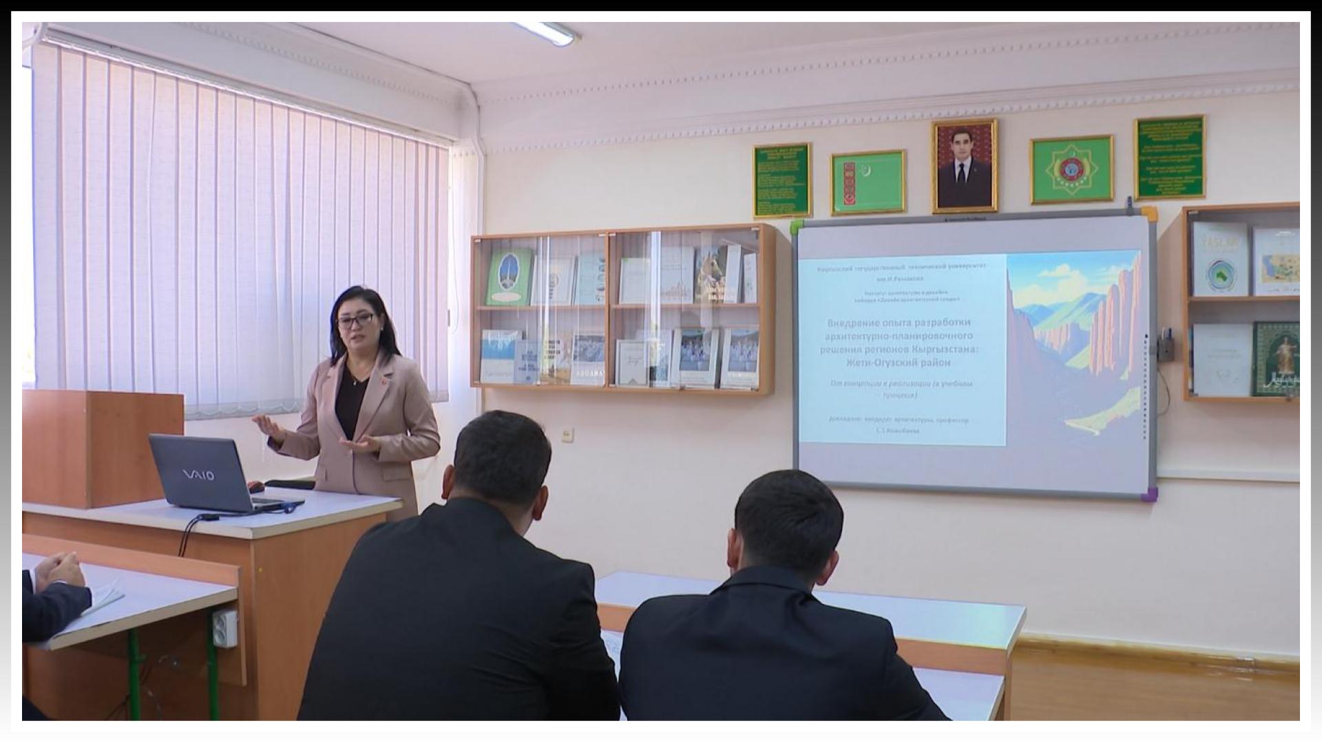 Türkmen döwlet binagärlik-gurluşyk institutynda  I.Razzakow adyndaky Gyrgyz döwlet tehniki uniwersitetiniň Binagärlik we dizaýn institutynyň direktory Kožobaýewa Saltanat Tolonbaýewna gurluşyk we binägärlik ugry boýunça  umumy okuw sapagyny geçirdi.